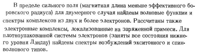 В пределе сильного поля (магнитная длина меньше эффективного бо-ровского радиуса) для двумерного случая найдены волновые функции и спектры комплексов из двух и более электронов. Рассчитаны также электронные комплексы, локализованные на заряженной примеси. Для плотноупакованной системы электронов (заняты все состояния нижнего уровня Ландау) найдены спектры возбуждений экситонного и спин-волнового типов с