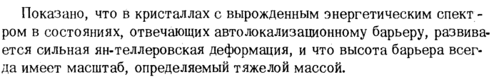 Показано, что в кристаллах с вырожденным энергетическим спект ром в состояниях, отвечающих автолокализационному барьеру, развивается сильная ян-теллеровская деформация, и что высота барьера всегда имеет масштаб, определяемый тяжелой массой.
