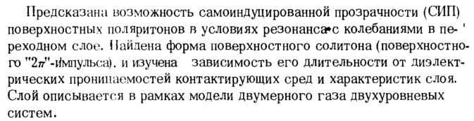 Предсказана возможность самоиндуцированной прозрачности (СИП) поверхностных поляритонов в условиях резонанса*с колебаниями в пе1 реходном слое. Найдена форма поверхностного солитона (поверхностного "2тЛ14мпульеа), и изучена зависимость его длительности от диэлектрических пронипаемостей контактирующих сред и характеристик слоя. Слой описывается в рамках модели двумерного газа двухуровневых систем.