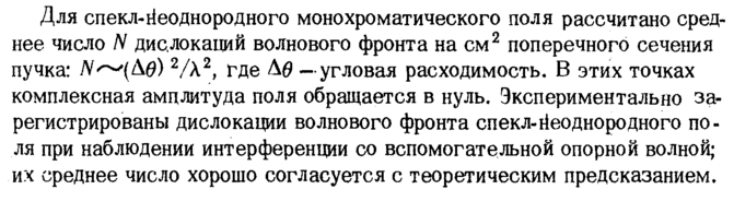 Для спекл-йеоднородного монохроматического поля рассчитано среднее число N дислокаций волнового фронта на см2 поперечного сечения пучка: #^-(Δ0) 2/λ2, где Δ0 — угловая расходимость. В этих точках комплексная амплитуда поля обращается в нуль. Экспериментально зарегистрированы дислокации волнового фронта спекл-йеоднородного поля при наблюдении интерференции со вспомогательной опорной волной; их среднее число хорошо согласуется с теоретическим предсказанием.