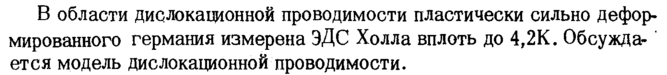 В области дислокащонной проводимости пластически сильно деформированного германия измерена ЭДС Холла вплоть до 4,2К. Обсужда-' ется модель дислокационной проводимости.