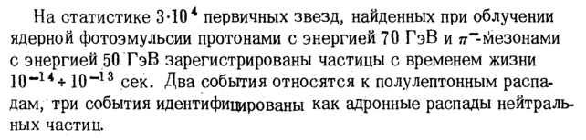 На статистике 3*10 4 первичных звезд, найденных при облучении ядерной фотоэмульсии протонами с энергией 70 ГэВ и п~ Сезонами с энергией 50 ГэВ зарегистрированы частицы с временем жизни 10~14 + 10~13 сек. Два события относятся к полулептонным распадам, три события идентифищрованы как адронные распады нейтральных частиц.