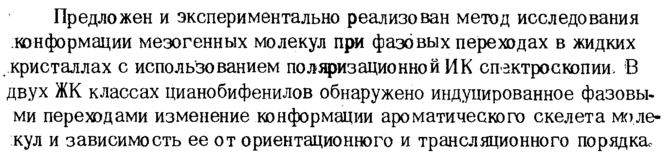 Предложен и экспериментально реализован метод исследования информации мезогенных молекул при фазовых переходах в жидких .кристаллах с использованием поляризационной ИК сп-зктроскопии, В двух ЖК классах цианобифенилов обнаружено индуцированное фазовыми переходами изменение конформации ароматического скелета молекул и зависимость ее от ориентационного и трансляционного порядкас