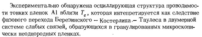Экспериментально обнаружена осциллирующая структура проводимости тонких пленок А1 вблизи Τ , которая интепретируется как следствие фазового перехода Березинского ~ Костерлица.Таулеса в двумерной системе слабых связей, образующихся в гранулированных микроскопически неоднородных пленках*