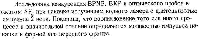 Исследована конкуренция ВРМБ, ВКР и оптического пробоя в сжатом SF6 при накачке излучением йодного лазера с длительностью импульса 2 нсек. Показано, что возникновение того или иного процесса в значительной степени определяется мощностью импульса накачки и формой его переднего фронта