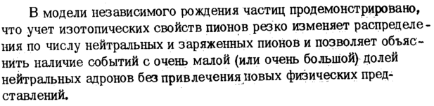 В модели независимого рождения частиц продемонстрировано, что учет изотопических свойств пионов резко изменяет распределе ния по числу нейтральных и заряженных пионов и позволяет объяснить наличие событий с очень малой (или очень большой) Долей нейтральных адронов без привлечения вовых физических представлений.