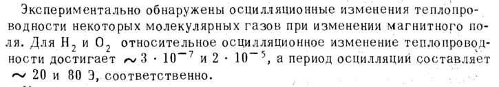 Экспериментально обнаружены осцилляционные изменения теплопроводности некоторых молекулярных газов при изменении магнитного поля. Для Н2 и 02 относительное осцилляционное изменение теплопроводности достигает 3 · 10"~7 и 2 * 10""5, а период осцилляции доставляет ~ 20 и 80 Э, соответственно.