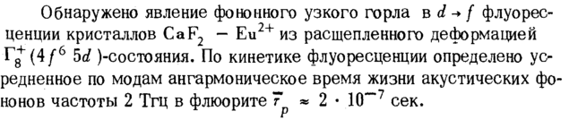 Обнаружено явление фононного узкого горла в d -* f флуоресценции кристаллов CaF2 Eu2+ из расщепленного деформацией Г^(4/6 5с? )-состояния. По кинетике флуоресценции определено усредненное по модам ангармоническое время жизни акустических фо-нонов частоты 2 Тгц в флюорите 7*2· 10-"7 сек.