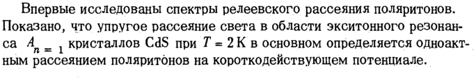 Впервые исследованы спектры релеевского рассеяния поляритонов. Показано, что упругое рассеяние света в области экситонного резонанса 4П кристаллов CdS при Τ = 2 К в основном определяется одноактным рассеянием поляритонов на короткодействующем потенциале.
