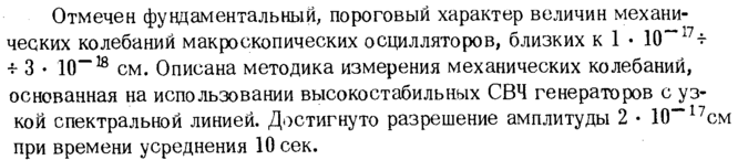 Отмечен фундаментальный, пороговый характер величин механических колебаний макроскопических осцилляторов, близких к 1 · 10~17-г -ь 3 · 10eJ8 см. Описана методика измерения механических колебаний, основанная на использовании высокостабильных СВЧ генераторов с узкой спектральной линией. Достигнуто разрешение амплитуды 2 · 10~17см при времени усреднения 10 сек.