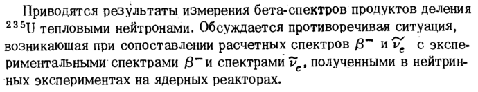 Приводятся результаты измерения бета-спектров продуктов деления 235U тепловыми нейтронами. Обсуждается противоречивая ситуация, возникающая при сопоставлении расчетных спектров β~* и с экспериментальными спектрами /3~и спектрами Ve, полученными в нейтринных экспериментах на ядерных реакторах.
