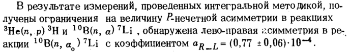 В результате измерений, проведенных интегральной методикой, получены ограничения на величину ^-нечетной асимметрии в реакциях 3Не(п,.р) 3Н и 10B(n, a) 7Li , обнаружена лево-правая асимметрия в реакции 10В(л, а ) 7Li с коэффициентом = (0,77 ±0,06)Ί0"^.