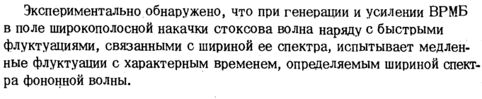 Экспериментально,обнаружено, что при генерации и усилении ВРМБ в поле широкополосной накачки стоксова волна наряду с быстрыми флуктуациями, связанными с шириной ее спектра, испытывает медленные флуктуации с характерным временем, определяемым шириной спектра фононной волны.