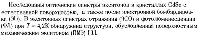 Исследованы оптические спектры экситонов в кристаллах CdSe с естественной поверхностью, а также после электронной бомбардировки (ЭБ). В экситонных спектрах отражения (ЭСО) и фотолюминесценции (ФЛ) при Τ = 4,2К обнаружена структура, обусловленная поверхностным механическим экситоном (ПМЭ) [1].