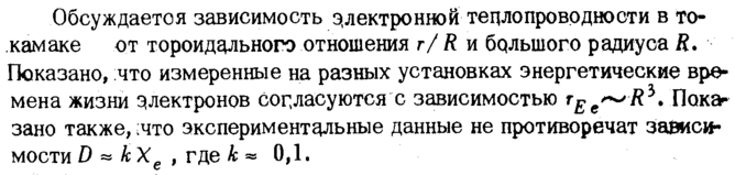 Обсуждаетоя зависимость электронной теплопроводности в то-камаке от тороидального отношения г/ R и большого радиуса й. Показано, что измеренные на разных установках энергетические времена жизни электронов согласуются с зависимостью rEe^R^. Показано также, ;что экспериментальные данные не противоречат зависимости D « кХр , где к « 0,1.