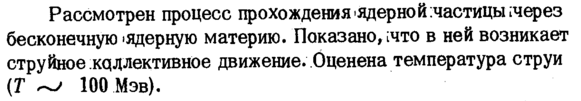 Рассмотрен процесс прохождения ядерной:частицьнчерез бесконечную одерную материю. Показано, ;что в ней возникает струйное коллективное движение. Оценена температура струи (Г ~> 100 Мэв).