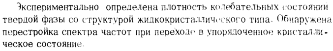Экспериментально определена плотность колебательных состоянии твердой фазы со структурой жидкокристаллического типа. Обнаружена перестройка спектра частот при переходе в упорядоченное кристаллическое состояние.