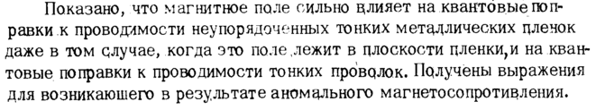 Показано, что магнитное поле сильно цлияет на квантовые поправки к проводимости неупорядоченных тонких метадлических цленок даже в том длучае, когда это поле,лежит в плоскости цленки,и на квантовые поправки к проводимости тонких проволок. Получены выражения для возникающего в результате аномального магнетосопротицления.