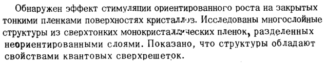 Обнаружен эффект стимуляции ориентированного роста на закрытых тонкими пленками поверхностях кристаллов. Исследованы многослойные структуры из сверхтонких монокриста№ческих пленок, разделенных неориентированными слоями. Показано, что структуры обладают свойствами квантовых сверхрешеток.