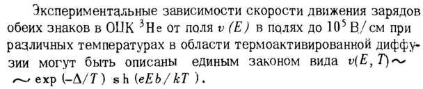 Экспериментальные зависимости скорости движения зарядов обеих знаков в 011К 3Не от поля ν (Ε) в прлях до 105 В/см при различных температурах в области термоактивированной диффузии могут быть описаны единым законом вида ν(Ε,Τ)^ — ехр (-Δ/7) sh {еЕЬ/кТ ).