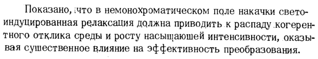 Показано, (что в немонохроматическом поле накачки свето-индуцированная релаксация должна приводить к распаду когерентного отклика среды и росту насыщающей интенсивности, оказывая существенное влияние на эффективность преобразования.