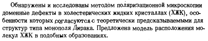 Обнаружены и исследованы методом поляризационной микроскопии доменные дефекты в холестерических жидких кристаллах (ХЖК), особенности которых согласуются с теоретически предсказываемыми для структур типа монополя Дирака. Предложена модель расположения молекул ХЖК в подобных образованиях.