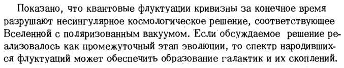 Показано, что квантовые флуктуации кривизны за конечное время разрушают несингулярное космологическое решение, соответствующее Вселенной с поляризованным вакуумом. Если обсуждаемое решение реализовалось как промежуточный этап эволюции, то спектр народившихся флуктуаций может обеспечить образование галактик и их скоплений.