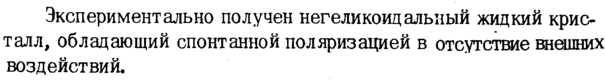Экспериментально получен негеликоицальный жидкий кристалл, обладающий спонтанной поляризацией в отсутствие внешних воздействий.