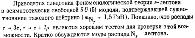 Приводятся следствия феноменологической теории г-лептона в асимптотически свободной S U (5) модели, подтверждающей существование тяжелого нейтрино (mN » 1,5 ГэВ). Показано, (что распады г τ -> 3<?, τ -> е + 2μ являются хорошим тестом для проверки этой возможности. Кратко обсуждаются моды распада Nr лептона.