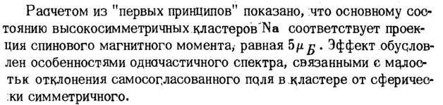 Раачетом из "первых принципов" показано, что основному состоянию высокосимметричных кластеров Ма соответствует проекция спинового магнитного момента,равная 5μβ . Эффект обудлов-лен особенностями одначастичного спектра, связанными с м^лоо-тьк отклонения самосогласованного прля в кластере от сферически симметричного.