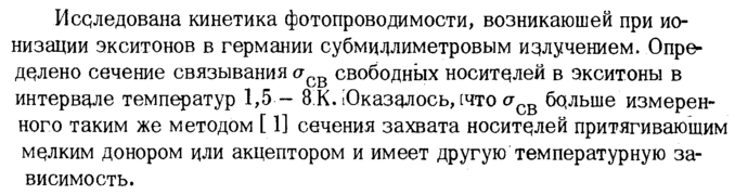 Исдледована кинетика фотопроводимости, возникающей при ионизации экситонов в германии субмвдлиметровым излучением. Определено сечение связывания σ0β свободных носителей в экситоны в интервале температур 1,5 8 К. Юказдлось, [что aQB бальше измеренного таким же методом [1] сечения захвата носителей притягивающим мелким донором щи акцептором и имеет другую температурную зависимость.