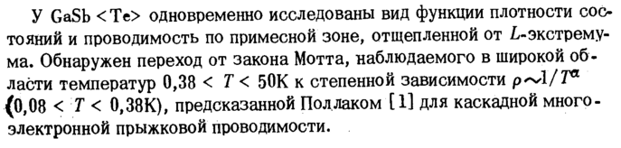У GaSb <Те> одновременно исследованы вид функции плотности состояний и проводимость по примесной зоне, отщепленной от L-экстрему-ма. Обнаружен переход от закона Мотта, наблюдаемого в широкой области температур 0,38 < Τ < 50К к степенной зависимости р^А/Т^ (0,08 < Τ < 0,38К), предсказанной Под лаком [1] для каскадной много-электронной прыжковой проводимости.