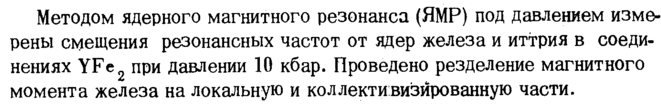 Методом ядерного магнитного резонанса (ЯМР) под давлением измерены смещения резонансных частот от ядер железа и иттрия в соединениях YFe2 при давлении 10 кбар. Проведено резделение магнитного момента железа на локальную и коллективизированную части.
