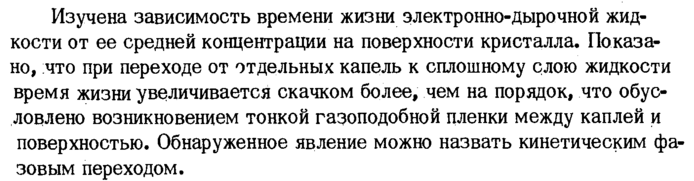 Изучена зависимость времени жизни электронно-дырочной жидкости от ее средней концентрации на поверхности кристалла. Показано, что при переходе от отдельных капель к сплошному слою жидкости время жизни увеличивается скачком более, чем на порядок, что обусловлено возникновением тонкой газоподобной пленки между каплей и поверхностью. Обнаруженное явление можно назвать кинетическим фазовым переходом.