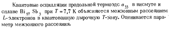 Квантовые осцилляции продольной термоэдс в висмуте и сплаве Bi97 Sb3 при Τ = 7,7 К объясняются межзонным рассеянием L-электронов в квантованную дырочную Г-зонуОценивается параметр межзонного рассеяния»