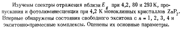 Изучены спектры отражения вблизи Ε^ при 4,2, 80 и 293 К, пропускания и фотолюминесценции при 4,2 К моноклинных кристаллов ΖηΡ2· Впервые обнаружены состояния свободного экситона с η « 1, 2, 3, 4 и экситонно-Примесные комплексы. Оценены их основные параметры.