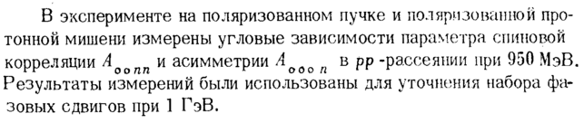 В эксперименте на поляризованном пучке и поляризованной протонной мишени измерены угловые зависимости параметра спиновой корреляции Аоолп и асимметрии ^о00 п в рр -рассеянии при 950 МэВ. Результаты измерений были использованы для уточнения набора фазовых сдвигов при 1 ГэВ.