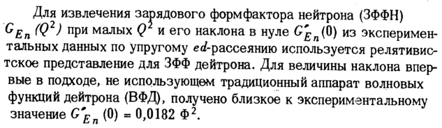 Для извлечения зарядового формфактора нейтрона (ЗФФН) GEn (Q2) ПРИ малы* Q и его наклона в нуле С£п(0) из экспериментальных данных по упругому erf-рассеянию используется релятивистское представление для ЗФФ дейтрона. Для величины наклона впервые в подходе, не использующем традиционный аппарат волновых функций дейтрона (ВФД), получено близкое к экспериментальному значение G*En (0) = 0,0182 Φ2.