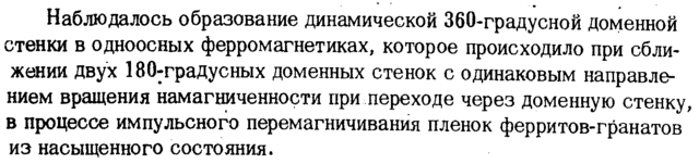 Наблюдалось образование динамической 360-градусной доменной стенки в одноосных ферромагнетиках, которое происходило при сближении двух 180-градусных доменных стенок с одинаковым направлением вращения намагниченности при переходе через доменную стенку, в процессе импульсного перемагничивания пленок ферритов-гранатов из насыщенного состояния.