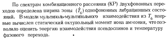 По спектрам комбинационного рассеяния (КР) двухфононных переходов определена ширина зоны (Т6) однофононных либрационных состояний. В модели мультиполь-мультипольного взаимодействия из Г6 впервые вычислен статический октупольный момент иона аммония, что позволило оценить энергию взаимодействия псевдоспинов и температуру фазового перехода.