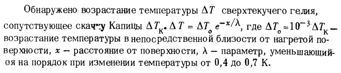 Обнаружено возрастание температуры Δ Г сверхтекучего гелия, сопутствующее скач"_у Капицы Δ 7^ Δ Г = -&Toe~*^f где ΔΤ^^ΙΟ"3^^-возрастание температуры в непосредственной близости от нагретой поверхности, χ — расстояние от поверхности, λ — параметр, уменьшающийся на порядок при изменении температуры от 0,4 до 0,7 К.