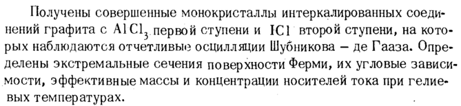 Получены совершенные монокристаллы интеркалированных соединений графита с А1СЦ первой ступени и 1С 1 второй ступени, на которых наблюдаются отчетливые осцилляции Шубникова де Гааза. Определены экстремальные сечения поверхности Ферми, их угловые зависи мости, эффективные массы и концентрации носителей тока при гелиевых температурах.