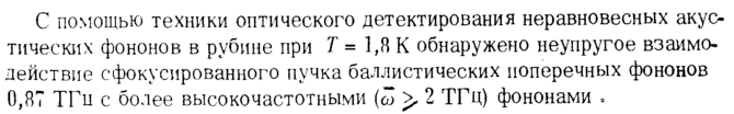С помощью техники оптического детектирования неравновесных акустических фононов в рубине при Τ = 1,8 К обнаружено неупругое взаимодействие сфокусированного пучка баллистических поперечных фононов 0,87 ТГи с более высокочастотными (ω > 2 ТГц) фононами .