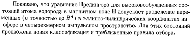 Показано, что уравнение Шредингера для высоковозбужденных состояний атома водорода в магнитном поле Η допускает разделение переменных (с точностью до Я4) в эллипсо-цилиндрических координатах на сфере в четырехмерном импульсном пространстве. Для этих состояний предложена новая классификация и приближенные правила отбора.
