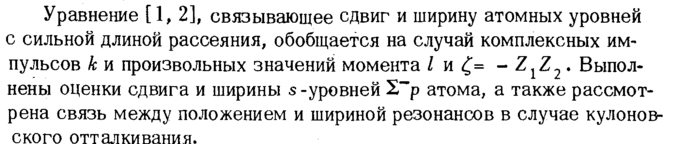 Уравнение [1, 2], связывающее сдвиг и ширину атомных уровней с сильной длиной рассеяния, обобщается на случай комплексных импульсов к и произвольных значений момента I и ζ= ΖιΖ2· Выполнены оценки сдвига и ширины s-уровней Σ"ρ атома, а также рассмотрена связь между положением и шириной резонансов в случае кулонов-ского отталкивания.