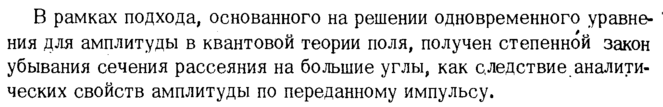В рамках подхода, основанного на решении одновременного уравнения для амплитуды в квантовой теории поля, получен степенной закон убывания сечения рассеяния на большие углы, как следствие.аналитических свойств амплитуды по переданному импульсу.