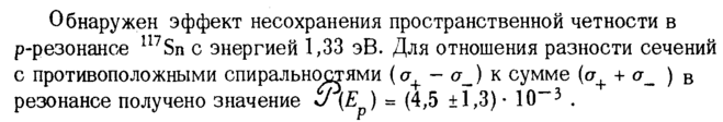 Обнаружен эффект несохранения пространственной четности в р-резонансе 117Sn с энергией 1,33 эВ. Для отношения разности сечений с противоположными спиральн0££ями (σ+ σ_) к сумме (σ+ + σ_ ) в резонансе получено значение J (Ε ) = (4,5 ±1,3) · Ю"3 .