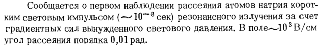 Сообщается о первом наблюдении рассеяния атомов натрия коротким световым импульсом (^10""8сек) резонансного излучения за счет градиентных сил вынужденного светового дацления. В поле~103В/см угол рассеяния порядка 0,01 рад.