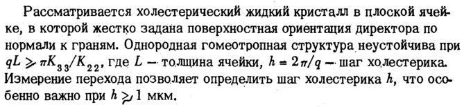 Рассматривается холестерический жидкий кристалл в плоской ячейке, в которой жестко задана поверхностная ориентация директора по нормали к граням. Однородная гомеотропная структура неустойчива при qL > пКзъ/К22, где L — толщина ячейки, h * 2n/q — шаг ходестерика. Измерение перехода позволяет определить шаг холестерика А, что особенно важно при h >j 1 мкм.