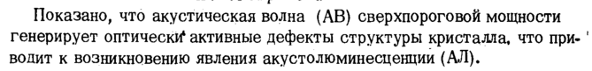 Показано, что акустическая волна (АВ) сверхпороговой мощности генерирует оптически4 активные дефекты структуры кристалла, что при-1 водит к возникновению явления акустолюминесценции (АЛ).